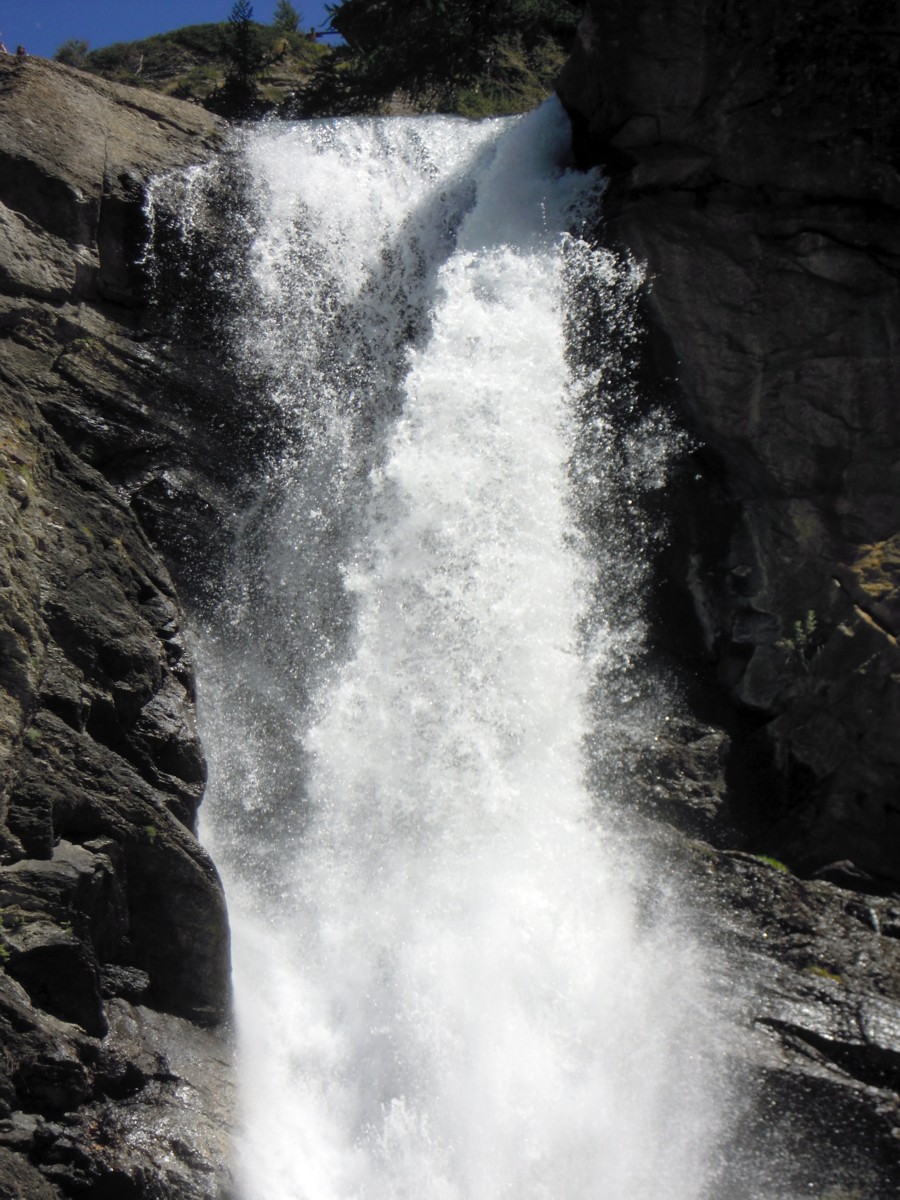Camminando tra gruppi di larici, si arriva alla base delle cascate e subito si incontra un primo modesto salto, a monte del quale, dopo un tratto di sentiero un poco più ripido, ci si affaccia sul secondo salto, il primo di una di una certa importanza: l’acqua abbondante dell’Urtier si getta in una conca profonda scavata dalla stessa nel corso dei secoli.